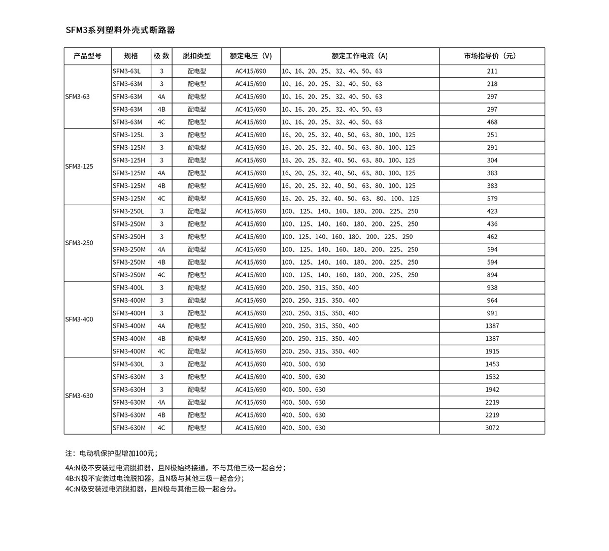 SFM3系列塑料外殼式斷路器(以下簡稱斷路器),適用于交流50/60Hz,其額定絕緣電壓至1000V,額定工作電壓415/690V,額定工作電流至8OOA的電路中作不頻繁轉換及電動機不頻繁起動之用(Inm≤40OA及以下)。斷路器具有過載、短路保護功能,能保護線路和電源設備不受損壞。可垂直安裝(即豎裝)也可以水平安裝。