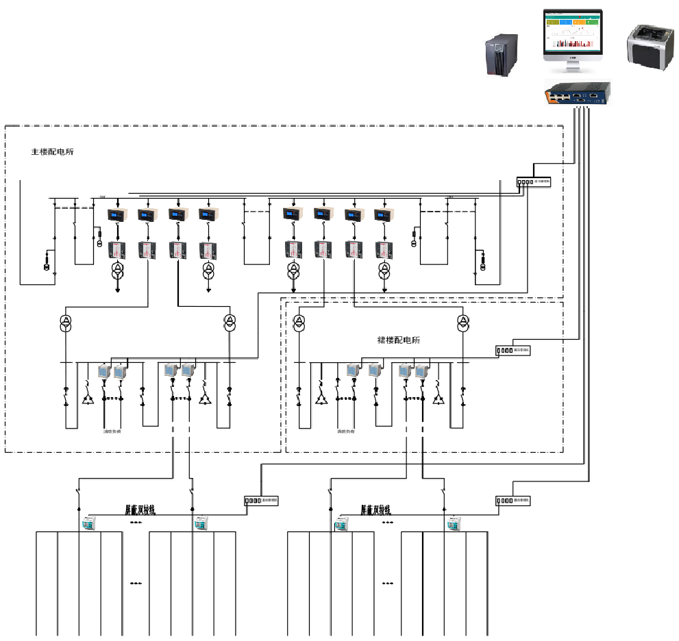 網(wǎng)絡(luò)通信層:網(wǎng)絡(luò)通信層是由各類通信設(shè)備和通信介質(zhì)組成的網(wǎng)絡(luò),實(shí)現(xiàn)系統(tǒng)整體管理層與現(xiàn)場(chǎng)測(cè)控層設(shè)備間的信息交互。網(wǎng)絡(luò)一般采用工業(yè)以太網(wǎng)、光纖環(huán)網(wǎng)以及RS485總線結(jié)構(gòu),主要包含S3100系列通信管理機(jī)、工業(yè)以太網(wǎng)交換機(jī)、光纖收發(fā)器以及光纖、通信線纜等設(shè)備。